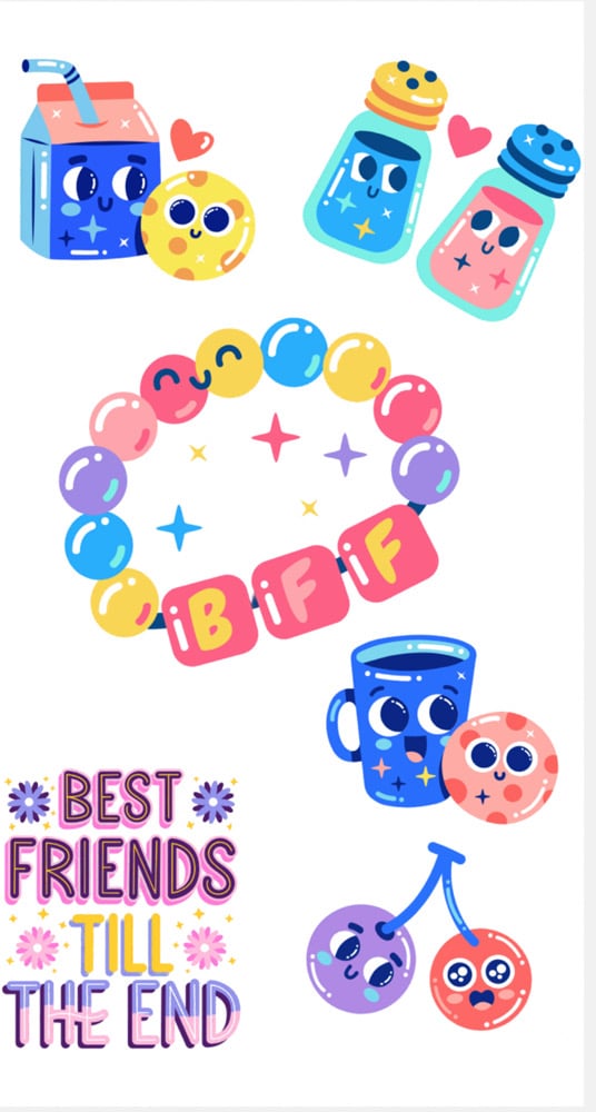 Celebrate friendship in the cutest way possible with our BFF Vibes Forever sticker drop! π This adorable set features colorful characters like milk & cookie, salt & pepper, and the happiest charm bracelets youβve ever seen. From matching cherries to smiling mugs, each sticker screams playful bestie energy. Plus, it includes a bold βBest Friends Till The Endβ quote and bracelet-style accents for that nostalgic friendship bracelet feel π«