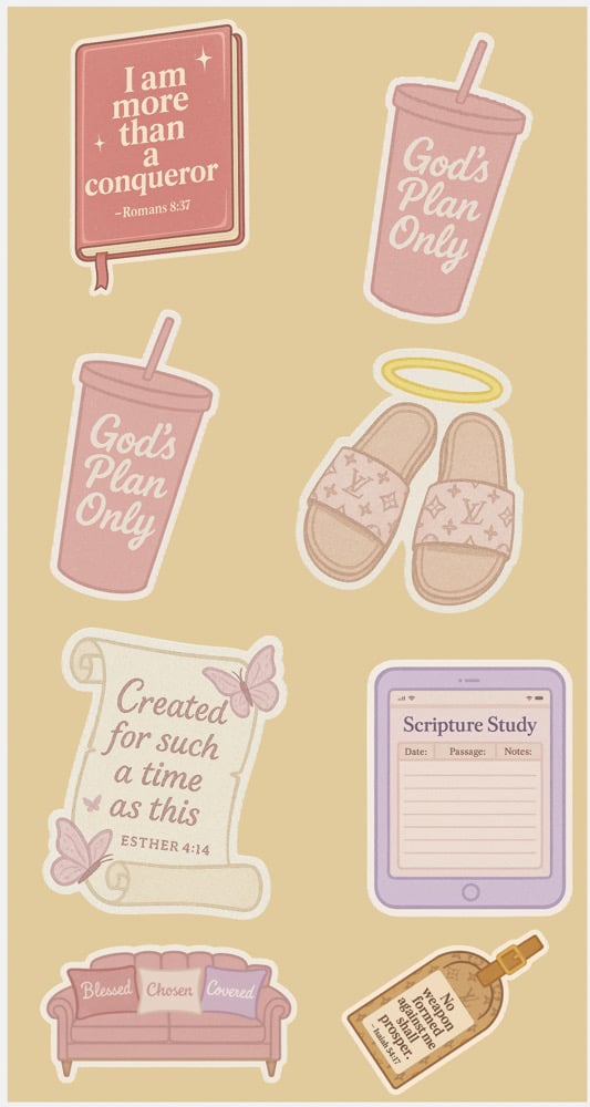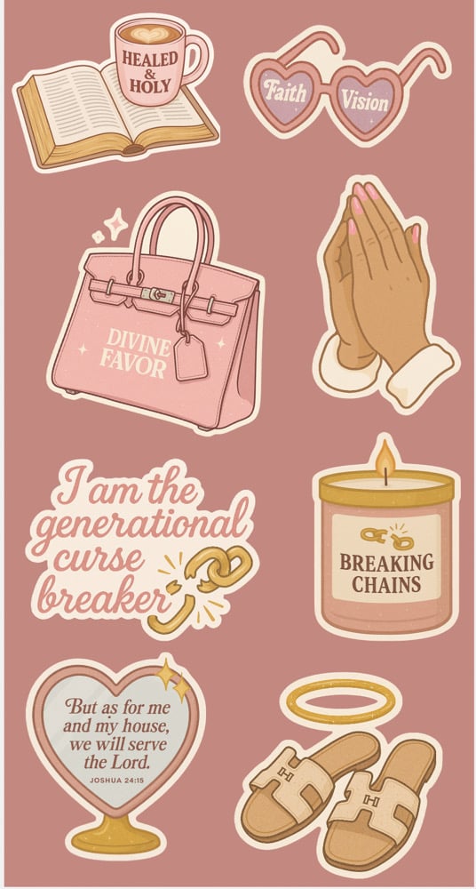 This empowering sticker pack features 20+ faith-based, girly-chic designs in soft blush tones with luxe energy. Whether you’re journaling, decorating your planner, or blessing your laptop with some Holy Ghost glam, these stickers are made to speak life.