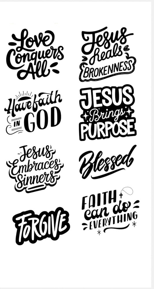 Bring your faith to life with our Faith-Filled Sunday Sticker Set, perfect for Bible journaling, Sunday reflections, and daily prayer journals. This inspiring collection features uplifting phrases like Love Conquers All, Jesus Heals Brokenness, Have Faith in God, Blessed, and more. Each sticker is crafted in bold, high-quality vinyl perfect for planners, journals, Bibles, and notebooks.