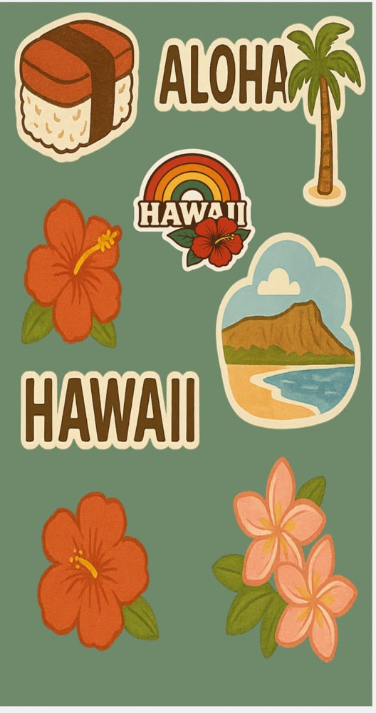 Bring a piece of paradise wherever you go with the Hawaii Mini Vibes sticker sheet. This collection of illustrated island icons captures the essence of aloha with warm tropical colors and playful vintage charm—perfect for scrapbooks, water bottles, or summer journaling.