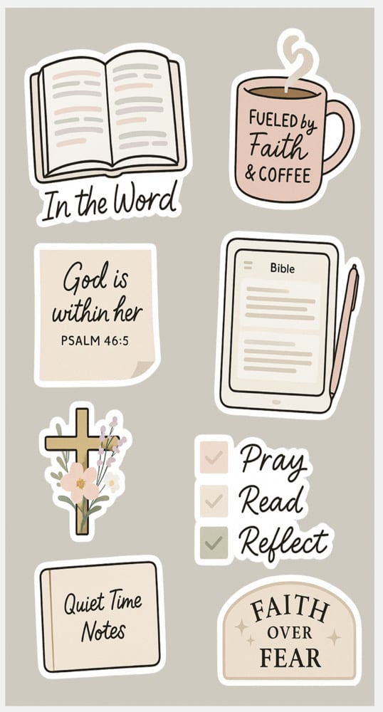 The Faith Over Fear sticker sheet is a peaceful, faith-centered set designed to uplift and guide your Bible study routine. This limited edition sheet blends a modern minimalist style with a warm, neutral palette—perfect for spiritual journaling, prayer tracking, and creating a sacred space in your planner or notebook.