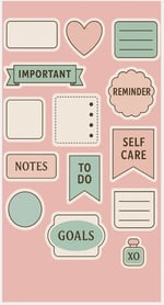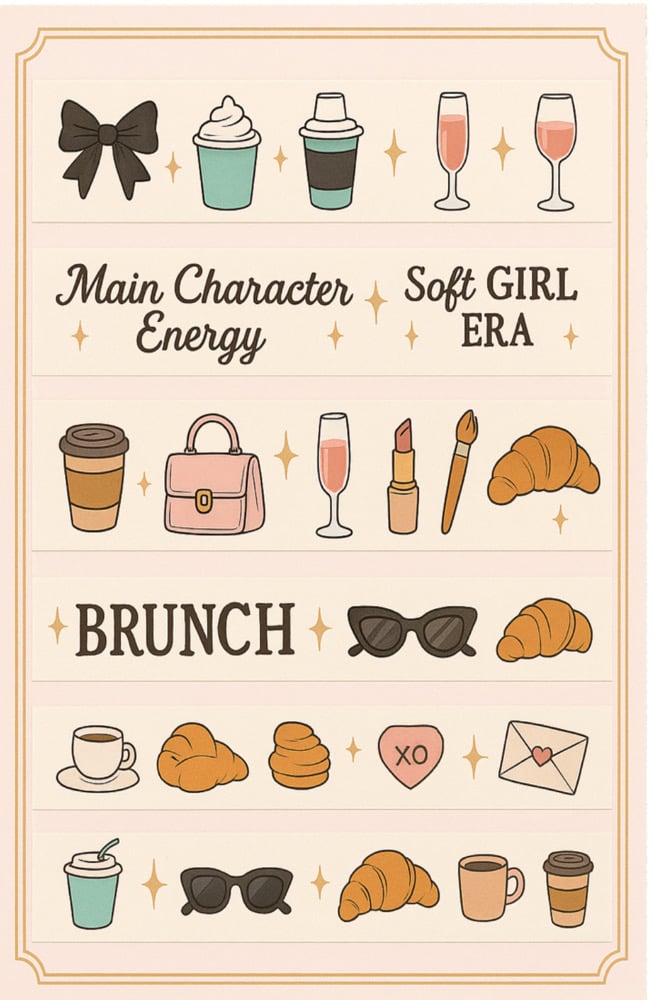 Step into your Soft Girl Era and sip in style with the Manifest & Mimosas sticker set — where main character energy meets boss brunch vibes. This beautifully curated collection includes diverse characters, coffee cups, croissants, pink heels, perfume, affirmations, washi strips, and planning labels to glam up your planners, vision boards, and journals.